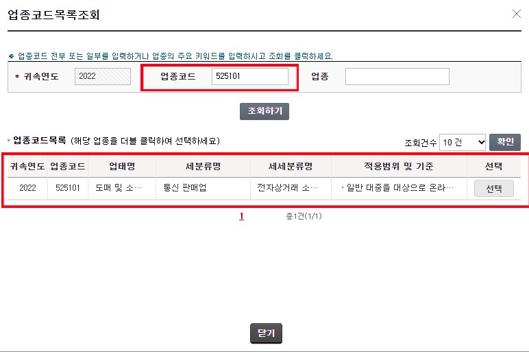 업종코드 525101 조회 후 도매 및 소매업/ 통신판매업 업종 더블클릭하여 선택 합니다.