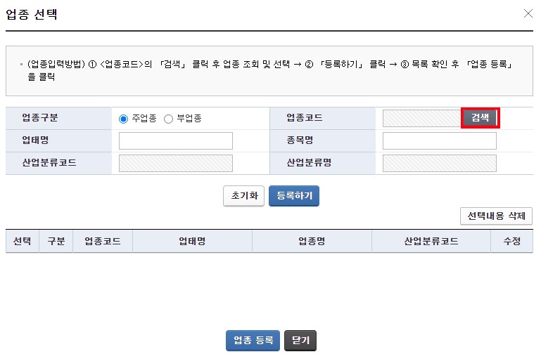 업종 선택란에 업종 입력/수정 눌러주시고 업종코드 검색 눌러주세요.