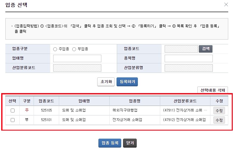마찬가지로 등록하기 누르게 되면 위 사진처럼 주업종/ 부업종 추가 된걸 확인 할 수 있습니다.