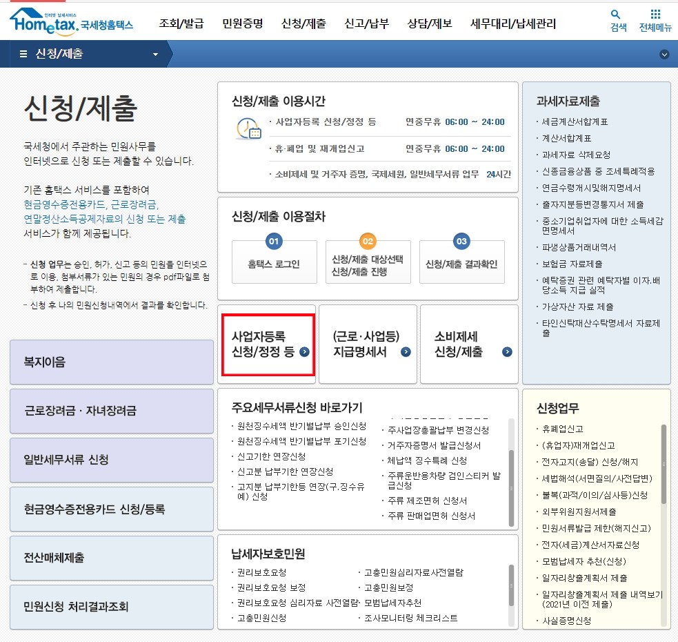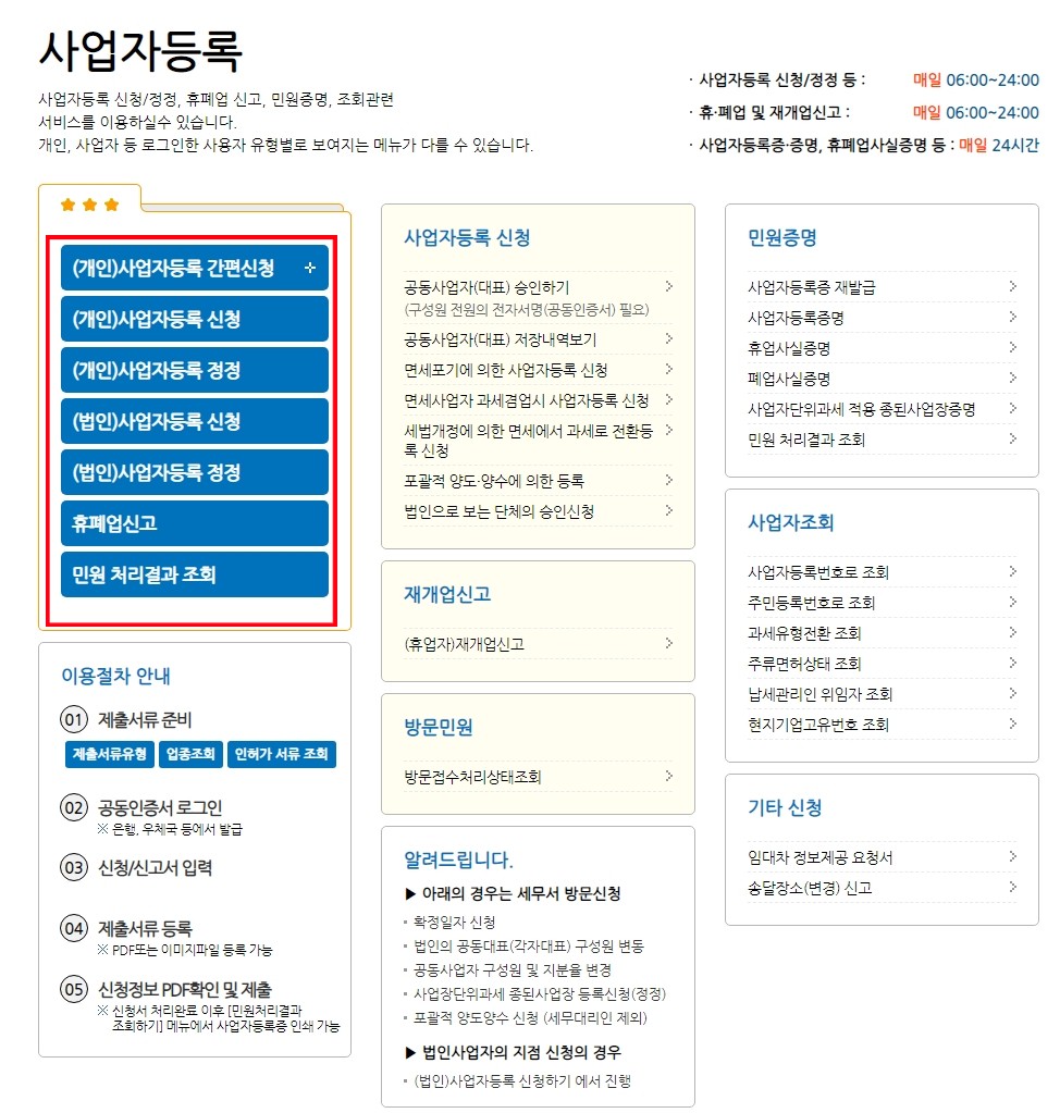 사업자등록 신청/정정 등 ->(개인) 사업자등록 신청