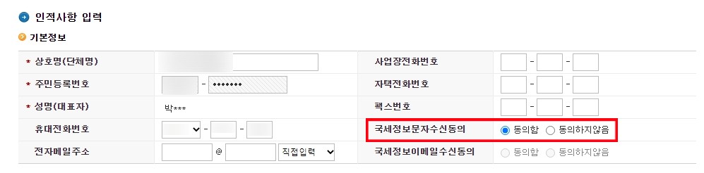 ※ 국세정보문자수신동의에 체크 꼭 해주셔야 합니다.